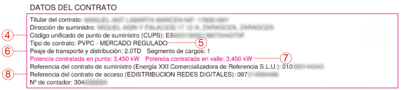 En este apartado, entre paréntesis aparece el nombre de tu distribuidora. Es muy interesante que te registres en la web de tu distribuidora (o como alternativa en Datadis.es) para acceder a tus datos de consumo hora a hora, ver los picos de potencia y otros datos del suministro.