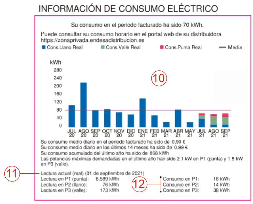 El gráfico existente en la factura muestra el consumo de los últimos 14 meses en cada tramo horario. Las claves de color indican si son consumos reales o estimados. La línea horizontal muestra el consumo medio mensual. Bajo el gráfico, aparece el consumo medio diario en el periodo facturado y el de los últimos 14 meses. Además, aparecerá el consumo total anual acumulado que una referencia muy útil para utilizar el comparador de tarifas de la OCU.