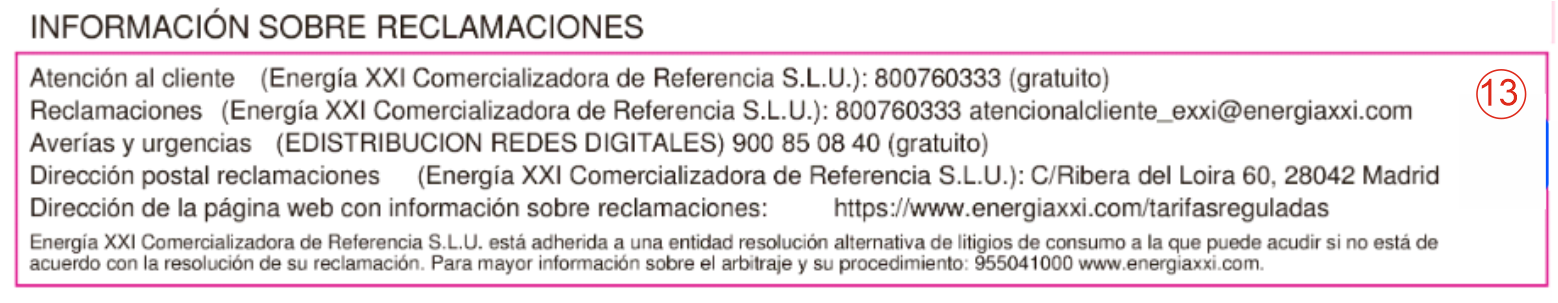 En este apartado se da información de los teléfonos de contacto (que deberían ser gratuitos) y del número para efectuar reclamaciones a la comercializadora, así como para dirigirte en caso de avería.