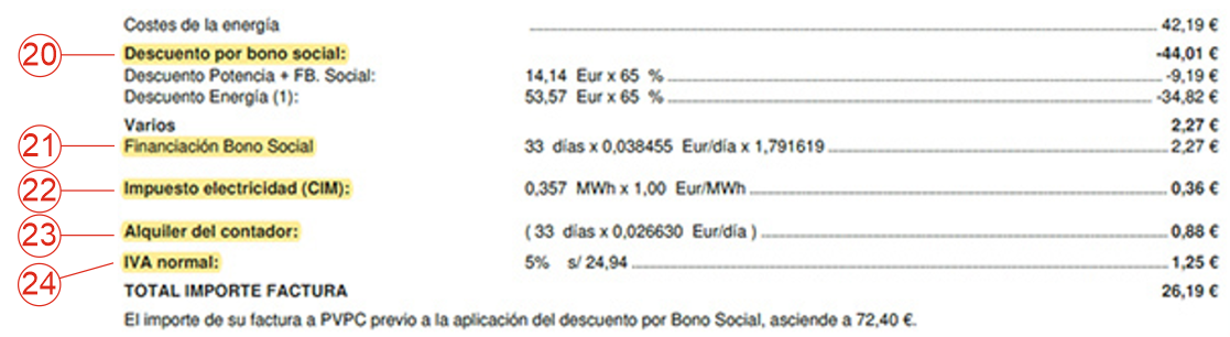 En el caso de tener “Bono Social” en la factura aparecerá el concepto Descuento por el Bono social con el porcentaje de descuento que te corresponde (25% o 40%) y los importes sobre los que se aplica ese descuento (término fijo y consumo).